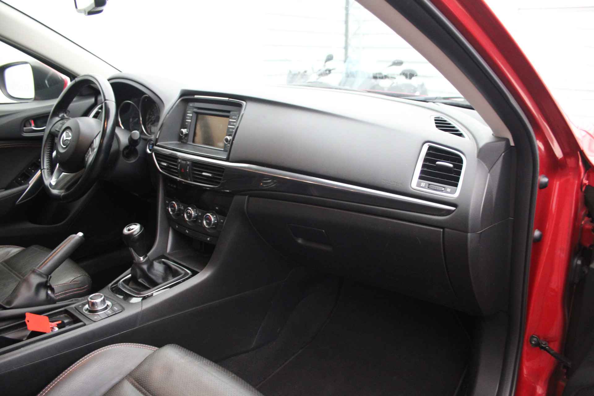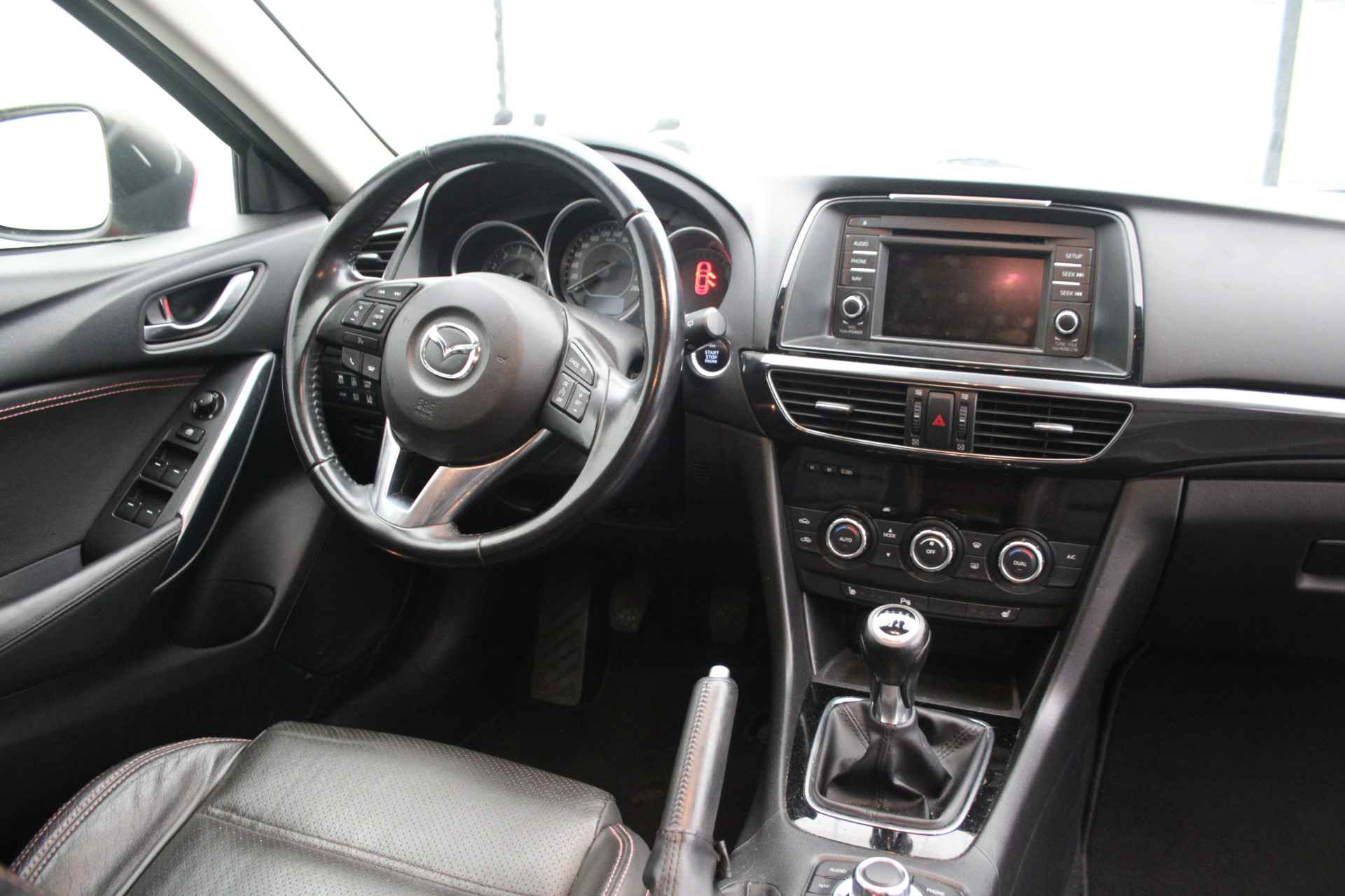 Alle technologie in de Mazda 6 Sportbreak is er op gericht om uw rit veilig en gemakkelijk te laten verlopen. De aandrijving komt voor rekening van een benzinemotor en een handgeschakelde zesversnellingsbak. Het interieur is luxe uitgevoerd met leren bekleding. Koude start? Niet met de verwarmbare voorstoelen! Xenonverlichting staat borg voor helderwit licht en een krachtige lichtbundel. U bespaart brandstof met het start-stopsysteem. Bij elk stoplicht, in iedere file en voor elke gesloten spoorboom of open brug. En reken maar dat dát scheelt! Bij de uitrusting van deze Mazda horen onder meer 19 inch lichtmetalen velgen, getint glas en snelheidsafhankelijke stuurbekrachtiging.